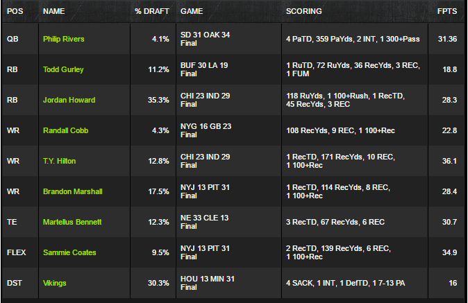 The strongest form of uniqueness here is structural. Most rosters pairing a four touchdown quarterback would try to collect at least one of his receivers. This build did the opposite. It treated Rivers as a pure quarterback score and used the saved receiver slots to capture ceilings from Hilton, Marshall, Coates, Cobb, and Bennett. That is a sharper allocation read than a routine stack because it recognized quarterback points could be harvested without insisting on direct attachment.