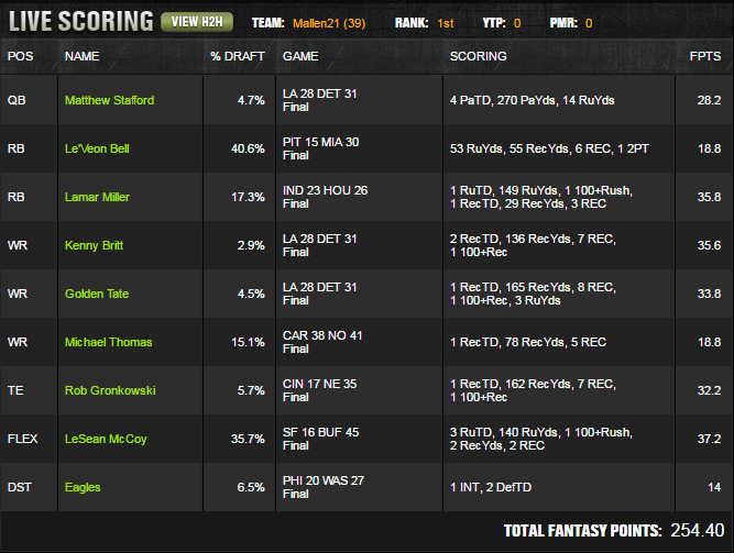 NFL 2016 | Week 6 | Sun, Oct 16, 2016 | STAFFORD DOUBLE WITH TATE AND KENNY BRITT RETURN, DOUBLE PAY UP RBS SMASH, EAGLES DST TOUCHDOWN