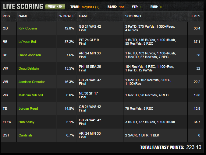 Doug Baldwin rounds out the construction with another 100 yard receiving bonus plus passing yardage on a trick play. That score mattered because it prevented the roster from depending on only one game environment. The winning formula here was concentrated Washington exposure, elite raw point backs, and one minimum salary receiver who broke the slate's pricing logic.