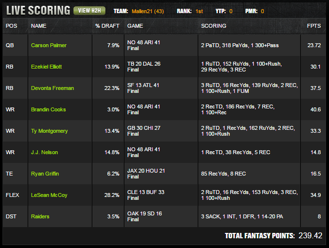 | FLEX | LeSean McCoy BUF RB | 28.2% | 8900 | 34.9 |
