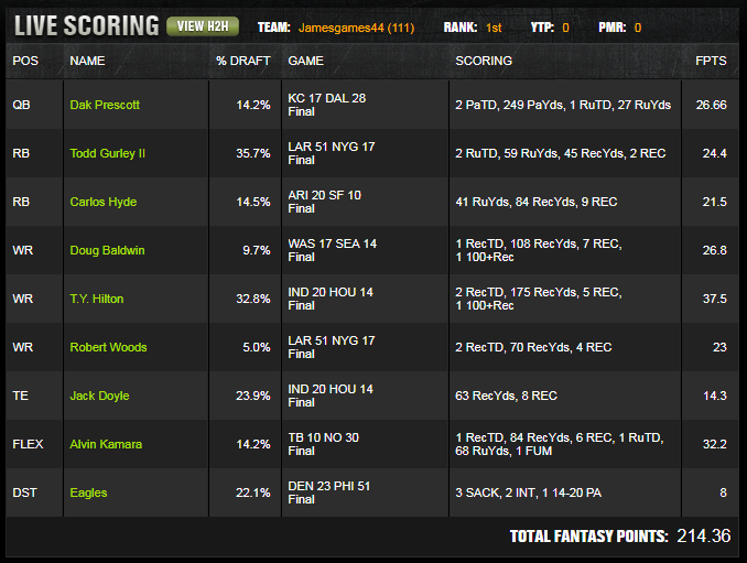 Robert Woods and Doug Baldwin complete the receiving mix. Woods turns a low salary slot into a two touchdown outcome. Baldwin gives reliable target volume plus a 100 yard bonus. The Eagles defense against Brock Osweiler is not a tournament breaker by raw score, yet it does enough while the field spends ownership on a strong matchup. This roster did not need a 20 point defense because the rest of the build already captured multiple slate defining receiver and running back outcomes.