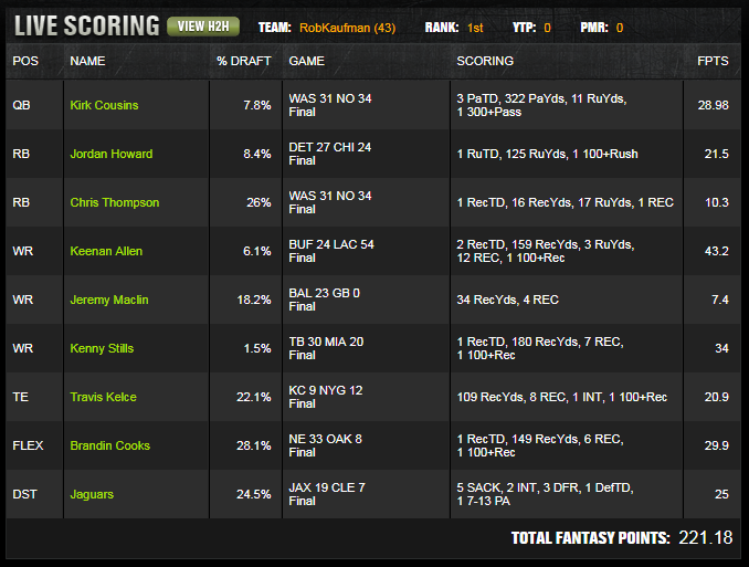 | DST | Jaguars JAX DST | 24.5% | 4000 | 25 |