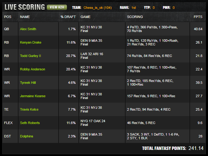 This roster is built around one game and one read. Kansas City at New York had hidden tournament value because Alex Smith had lost his premium tag by late season, yet his path to a slate winning score still existed when game flow forced him back into aggression. The lineup captures five pieces from this game, with Smith paired to Tyreek Hill and Travis Kelce, then brought back with Robby Anderson and Jermaine Kearse. This is a full game environment thesis without forcing a running back from either side. The build assumes passing volume, concentrated target distribution, and enough resistance from the Jets offense to keep Smith active for four quarters.