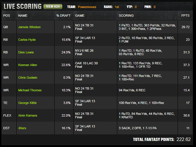 The remaining two pieces kept the roster from becoming too dependent on any one game script. Dion Lewis was a high quality volume back in a New England offense still capable of sharp touchdown distribution. Keenan Allen gave the build a premium receiver score with target certainty and yardage ceiling. Once Godwin broke the slate from the value range, the rest of the roster only needed its expensive pieces to behave like strong versions of themselves. They did.