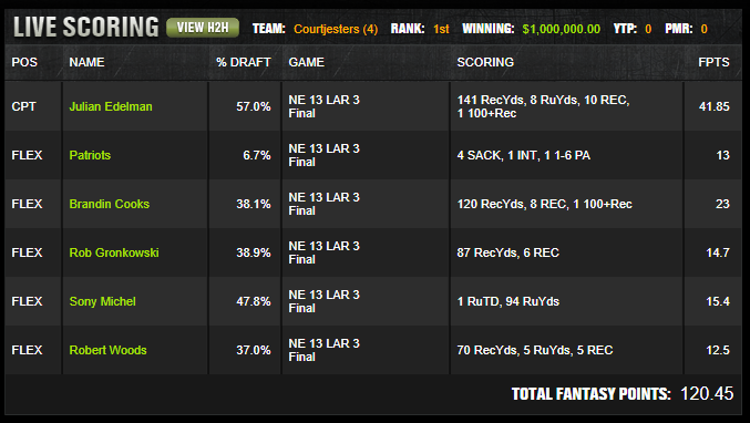 | FLEX | Patriots NE DST | 6.7% | 2800 | 13 |