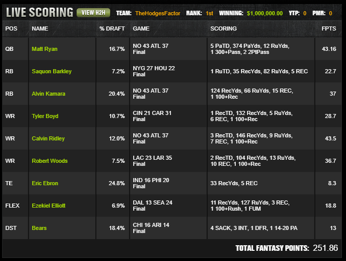 The most important separation point is the way the lineup handled the New Orleans Atlanta game. Many rosters could identify the dome environment. Fewer captured it through Matt Ryan plus Calvin Ridley while also using Alvin Kamara from the other side. Kamara was functioning as a reception vacuum in this offense, so his scoring path did not need rushing touchdowns. He could reach tournament winning output through catch volume and yardage alone, which is exactly what happened.