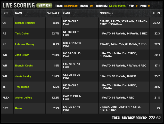 This roster captures a turning point in the 2018 season. Chicago game environments were becoming far more fantasy friendly than the field's earlier assumptions suggested, and this build leaned into that shift before the market fully caught up. Mitchell Trubisky was no longer a thin rushing quarterback with occasional passing volume. In this game environment, he became a ceiling quarterback tied to concentrated usage through Tarik Cohen and Trey Burton. The lineup uses all three. Trubisky supplies 333 passing yards and 81 rushing yards, Cohen captures the underneath and space touches, and Burton lands the tight end ceiling. The stack did not need a New England bring back because Chicago itself produced enough concentrated offense.