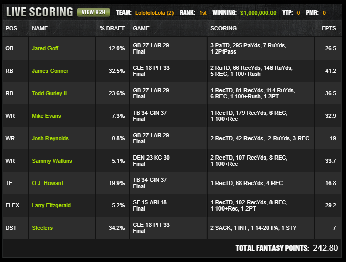 | DST | Steelers PIT DST | 34.2% | 2300 | 7 |