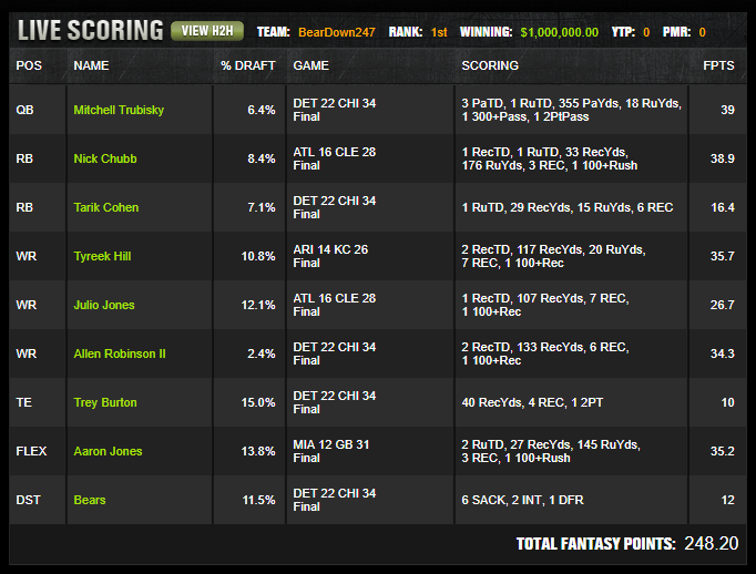 Primary lever: Five piece Chicago onslaught with Mitchell Trubisky, Tarik Cohen, Allen Robinson II, Trey Burton, and Bears defense against Matthew Stafford