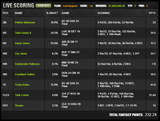 The lineup did not try to hide from strong plays. Mahomes, Kelce, Gurley, and Aaron Jones were all attractive options for good reason. Separation came from the pass catcher portfolio around them. Zay Jones at 0.2 percent was the largest swing, yet Cordarrelle Patterson and Courtland Sutton mattered too because they allowed this build to hold elite salary while still gaining ownership distance.