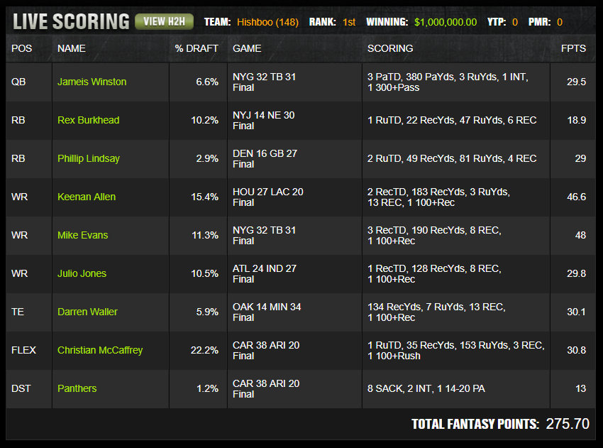 The strongest detail in this build is that uniqueness came from decision quality rather than from chaos. Mike Evans at 11.3 percent and Keenan Allen at 15.4 percent were not hidden plays. The separation came from stacking Evans with Winston instead of treating Evans as a one off receiver, then pairing that with Phillip Lindsay, Darren Waller, and the Panthers defense.