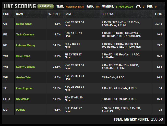 This roster wins with a sharp read on where 2019 ceiling was concentrating. The central decision is Daniel Jones in a full New York Detroit game stack, then surrounding him with volume and touchdown concentration from other spots where role clarity was unusually high. Jones is only 1.6 percent owned, yet he is tied to the most fantasy rich game on the roster. Golden Tate and Evan Engram give him direct access to New York passing production, while Kenny Golladay serves as the Detroit return. Once Jones throws four touchdowns, the entire build gets lifted by a quarterback score the field barely touched.