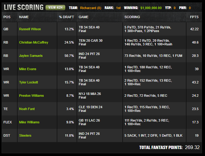 The Wilson, Lockett, Evans construction did serious damage because many builds with expensive McCaffrey plus Samuels salary relief still had to choose which passing game to emphasize. This roster chose the game most likely to turn into an exchange of downfield touchdowns and was rewarded with ceiling on both sides. Wilson was not low owned, but he did not need to be. Once he became the top quarterback on the slate, the game stack became one of the roster's strongest edges.