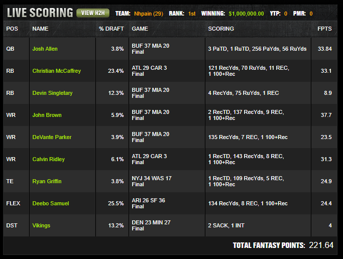 The strongest point of separation is the Buffalo Miami onslaught. Many rosters would use Josh Allen with John Brown. Fewer would add Devin Singletary and still bring it back with DeVante Parker. That structure made a strong statement about how the game would score. Buffalo would create touchdowns through Allen, Brown would capture a large share of the receiver ceiling, Singletary would stay involved enough to matter, and Miami would answer through concentrated passing volume rather than through a more balanced distribution.