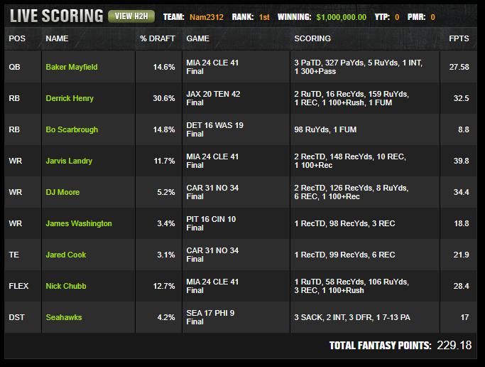 This lineup is built on one of the clearest truths of the 2019 season. Bad defenses kept staying bad, and the field could keep attacking them without needing a complicated story. Miami at Cleveland was one of those spots. Baker Mayfield with Jarvis Landry and Nick Chubb gave the roster direct access to nearly every useful Cleveland outcome, while the salary at quarterback stayed manageable. Mayfield did not need to post a historic score. He needed to clear the position while feeding the right teammates, and that is exactly what happened. Landry turned the stack into a first place path with 148 yards and two touchdowns, while Chubb supplied the rushing floor and touchdown equity that made the cluster hard to fail.