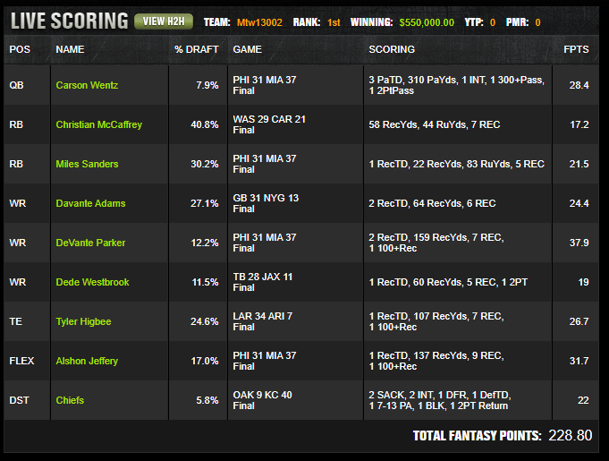 The Philadelphia Miami cluster is the main reason the lineup still had first place equity after eating so much popularity elsewhere. Wentz with Sanders and Jeffery, brought back by Parker, gave the roster four players from the game without pushing ownership into a range that made the entire build unusable. That is where the lineup found its lift.