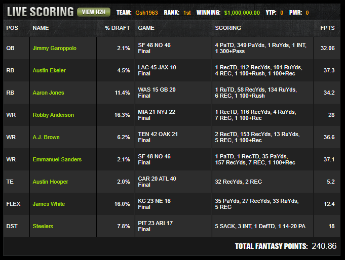 Austin Ekeler, A.J. Brown, Emmanuel Sanders, and Steelers defense all landed under 10 percent ownership. That is the leverage engine of the build. None of those selections were reckless. Each one had a clean path to a top percentile score. Taken together, they gave the lineup enough distance to survive Austin Hooper's weak output and still clear the field.