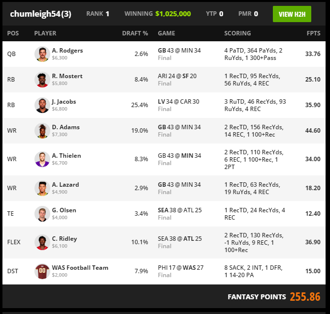 This lineup wins by treating the Green Bay Minnesota game as the slate’s scoring spine and refusing to overcomplicate how points would be distributed. Aaron Rodgers posts four passing touchdowns and a rushing touchdown, then the roster captures the touchdowns through Davante Adams and Allen Lazard while also taking Adam Thielen as the direct capture of Minnesota’s response. It is a true full game stack, not a token bringback, because four roster spots sit inside one game environment and the points concentrate through the exact players who touched every touchdown sequence.
