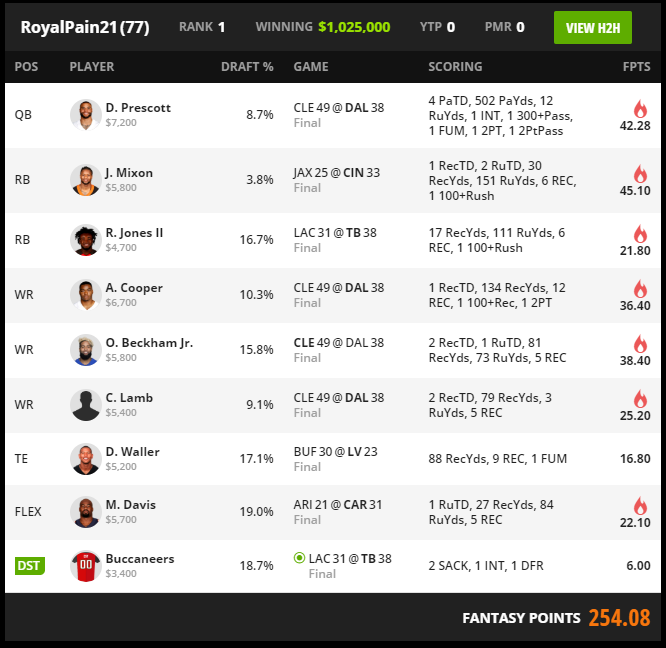 Joe Mixon was the structural hammer. At 3.8 percent ownership, his score changed the tournament. Dallas stacks were available to the field. Mixon's eruption inside a Dallas stack was far less common. This combination is where the lineup moved from strong to first place.