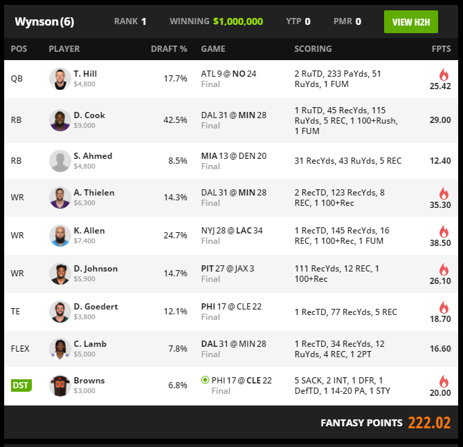 | RB | Dalvin Cook MIN RB | 42.5% | 9000 | 29 |