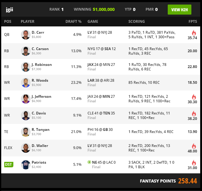 Corey Davis is the largest tournament swing in the non quarterback slots. His salary allowed the lineup to avoid thin punts while still keeping Waller, Jefferson, and Robinson. When a midrange receiver reaches 182 yards, the roster gains leverage over lineups that spread exposure across safer but lower ceiling options.