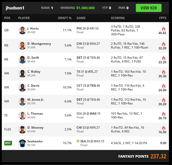 This roster wins because it captures several concentrated scoring paths without forcing a conventional quarterback stack. Jalen Hurts is the center of the build. He starts his run as Philadelphia's new quarterback and immediately posts a score strong enough to lead a tournament winner without any attached pass catcher. His profile made a naked build viable because a large share of his ceiling came through rushing plus red zone control rather than pure passing distribution. Once he reached 338 passing yards, 63 rushing yards, and four total touchdowns, the savings and flexibility from a naked quarterback build became far more valuable than chasing a narrow correlation tree.