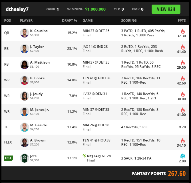 This is what a ceiling based Week 17 winner can look like. It does not require perfection at every slot. It requires being right about where the truly irreplaceable scores will come from. Cousins with Mattison and Marvin Jones Jr., Taylor as the chalk hammer, and the Cooks Brown game environment were more than enough.