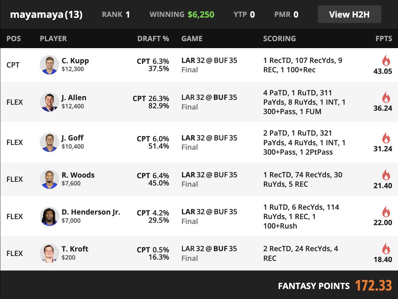 The Buffalo side was handled differently. Josh Allen was mandatory because his production was too broad to leave behind in a game of this shape. Tyler Kroft was the separator. At 16.3 percent flex ownership and only 200 dollars in salary, he turned two short receiving touchdowns into a slate shifting salary release valve. That one decision is what allowed the lineup to keep both quarterbacks, captain Kupp, Woods, and Henderson together. Diagnosticly, the winning formula was not merely both quarterbacks plus a low owned captain. It was both quarterbacks plus a low owned captain plus the correct minimum salary touchdown source.