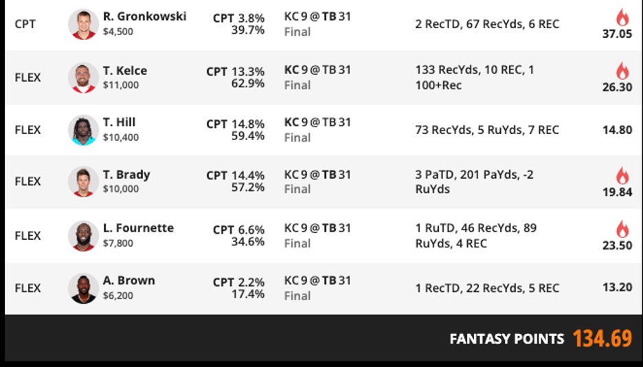 The rest of the lineup stayed attached to the game’s most bankable production. Tom Brady handled every Tampa Bay passing touchdown. Leonard Fournette added the rushing score and strong receiving support. Antonio Brown closed the Tampa Bay side by taking the remaining receiving touchdown at only 17.4 percent flex ownership. On the Kansas City side, Travis Kelce and Tyreek Hill were less about uniqueness and more about preserving exposure to the Chiefs target concentration in a trailing script. Kansas City failed to score a touchdown, but Kelce still delivered enough receiving volume to remain necessary, while Hill kept the lineup tied to the most likely explosive Chief.