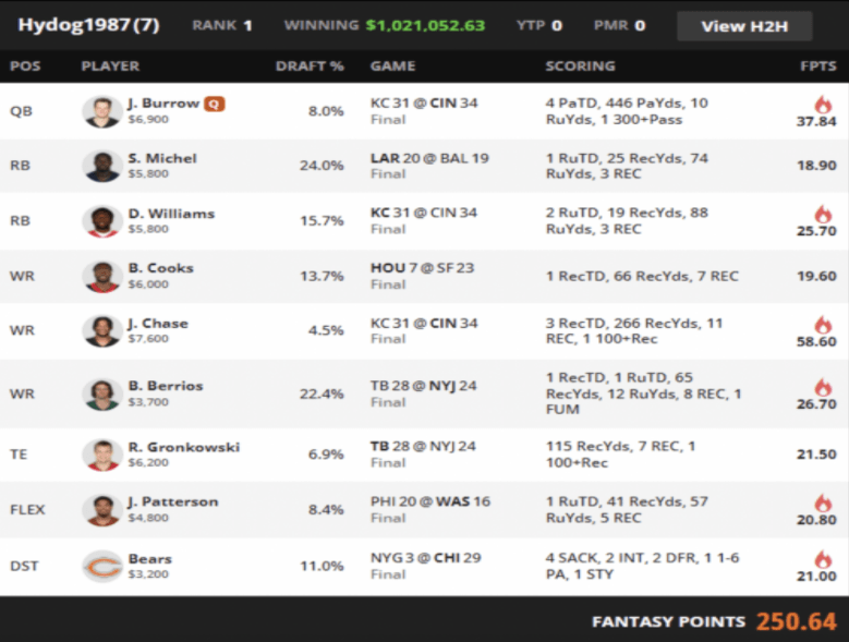 The ownership decisions are layered. Berrios and Michel are accepted chalk because their roles are direct and the pricing keeps the roster functional. The separation comes from Chase at 4.5 percent, a play many lineups could not reach once they built differently around quarterback and receiver pricing. Tight end is also a separation lever. Gronkowski produces a wide receiver style yardage bonus line at a position where many builds are chasing thin touchdown outcomes.