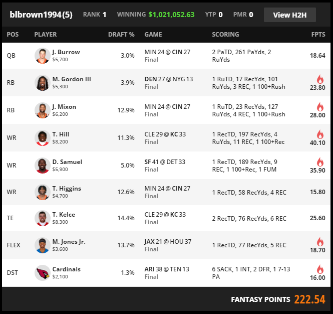 The build starts with a price based stance on Joe Burrow. At 5,700 and three percent ownership, Burrow functioned as a salary release valve for a slate where the two most expensive pieces were tied to Kansas City. Burrow did not need a ceiling game. He needed a clean 18.64 with two passing touchdowns, and he delivered without dragging in fragile, low volume pieces.