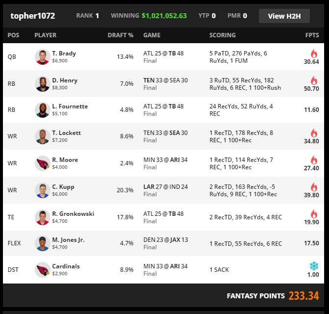 Cardinals defense is not a ceiling result in this specific week. The defense scores one point. Its role is salary alignment and roster continuity. That choice is important. The roster does not need every position to win its matchup. It needs the combination of Henry plus Tampa touchdowns plus two elite receiver lines to reach a first place total.