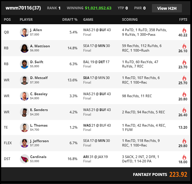 This roster wins by combining two game environments that produced bankable volume with a defensive block that kept showing up in optimal constructions. The foundation is WAS at BUF. Josh Allen lands a five touchdown day through four passing scores and a rushing score, and the roster captures the scoring distribution by pairing him with Cole Beasley and Emmanuel Sanders while also running it back with Logan Thomas. This is not a thin double stack. It is a full capture of how Buffalo scoring was allocated on this slate, with Beasley carrying reception volume and Sanders carrying multi touchdown access.