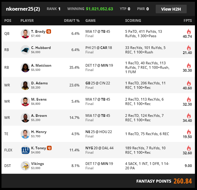 This roster is a two engine build with one game providing the quarterback ceiling and the other game providing the ownership anchor. Tampa Bay supplies the quarterback outcome through Tom Brady throwing for 411 yards and five touchdowns. The roster chooses the cleanest way to capture scoring concentration by pairing Brady with Mike Evans and Antonio Brown. Evans and Brown combine for four receiving touchdowns, which turns the passing outburst into locked points instead of hoping a single receiver lands the multi score result.