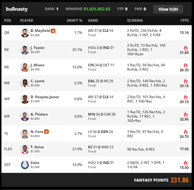 NFL 2021 | Week 6 | Sun, Oct 17, 2021 | CHEAP MAYFIELD STACK, DOUBLE TE CONSTRUCTION, COLTS DST WITH TAYLOR