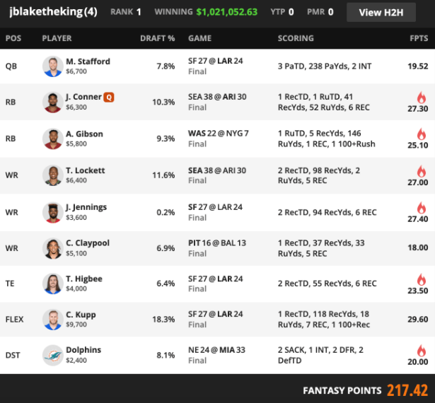 The rest of the roster is a Week 18 motivation read expressed through player roles. James Conner is used for touchdown access and receiving involvement, which keeps him viable even if Arizona rotates. Tyler Lockett pairs with Conner from the same game, which captures the points from a contest that clearly stayed aggressive on both sides. Antonio Gibson supplies the cleanest rushing volume outcome in the build, then Chase Claypool is the final stabilizer, providing enough points from a separate game to prevent the roster from being fully dependent on one environment.