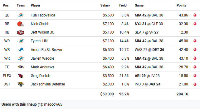 This winner is a pure game outcome capture from MIA at BAL, then a disciplined refusal to chase secondary correlations elsewhere. Tua Tagovailoa, Tyreek Hill, and Jaylen Waddle form the double stack, then Mark Andrews completes the game environment capture as the bringback. The scoring distribution inside Miami makes the structure coherent. Tagovailoa throws six passing touchdowns and four go to Hill and Waddle. The lineup does not need to guess which Miami receiver gets the eruption because it carries both, and it does not need a Baltimore quarterback because Andrews supplies the direct path to Ravens touchdown access.