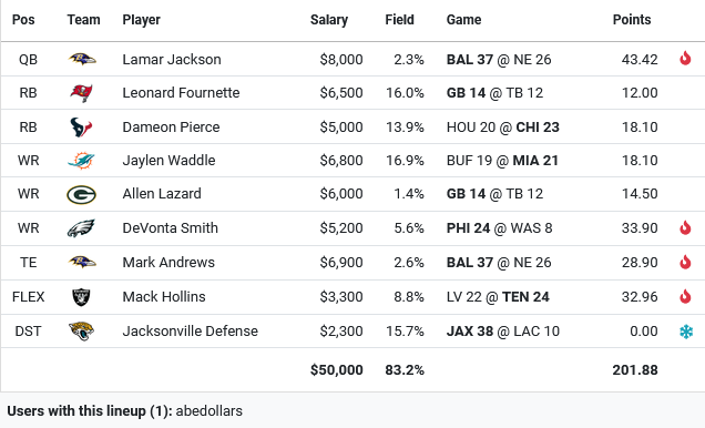 The roster wins while taking multiple ownership positions the field also holds, because the differentiators sit in the right slots. Jaylen Waddle and Leonard Fournette do not need ceiling games because they score enough relative to weak slate running back outcomes. The roster is free to win through its four highest leverage outcomes: Lamar Jackson as the overall slate quarterback, Mark Andrews as the tight end ceiling, DeVonta Smith as the wide receiver eruption, and Mack Hollins as the salary relief score that changes the roster economy.