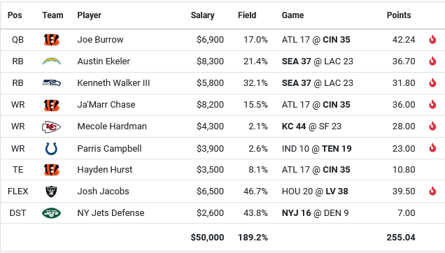 The lineup wins by concentrating ownership in places where the field cannot create true separation anyway, then taking its separation in the two wide receiver slots that most lineups treat as filler. The no bring back Burrow double stack avoids a common lineup tree, and the Hardman plus Campbell combination is uncommon even among players who rostered Burrow and Chase. The running back trio is popular, but the exact construction is less duplicated because many builds choose a fourth wide receiver instead of the third running back.
