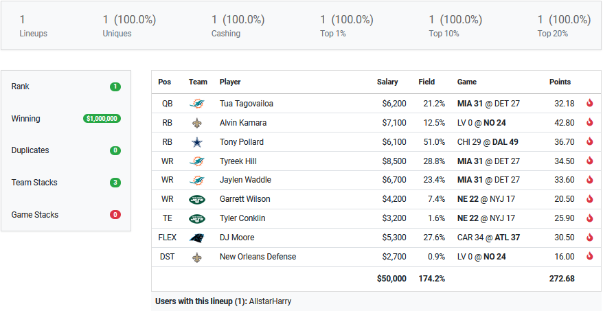 This roster is a concentrated ceiling build with selective correlation and one major omission. The anchor is the Miami passing tree. Tua Tagovailoa is paired with Tyreek Hill and Jaylen Waddle, then the build stops. No Detroit piece comes back. In a game that still reaches 58 real points, the Dolphins side carries the entire payoff because Hill and Waddle hold a massive share of the targets and air yards. Detroit scoring does not force a single Lion into the winning lineup, since production spreads across role players and fails to consolidate into one separator.