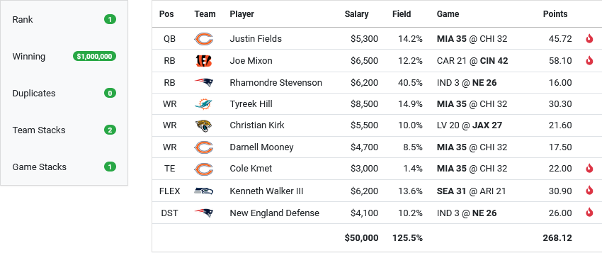 NFL 2022 | Week 9 | Sun, Nov 06, 2022 | FIELDS DOUBLE WITH MOONEY AND KMET, STEVENSON PLUS PATRIOTS DST, MIXON SLATE BREAKER