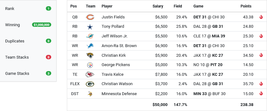 This roster wins by refusing the default stacking reflex and still capturing correlation where it matters. Justin Fields runs as the primary scoring engine, so the build skips the traditional Bears pass catcher attachment. Instead, the correlation arrives through the opposing alpha, Amon-Ra St. Brown. A big Fields outcome pushes Detroit into aggressive volume, and Detroit’s offense funnels through St. Brown more than any other skill player. Fields does not need a paired receiver for ceiling, but St. Brown benefits from Chicago scoring.