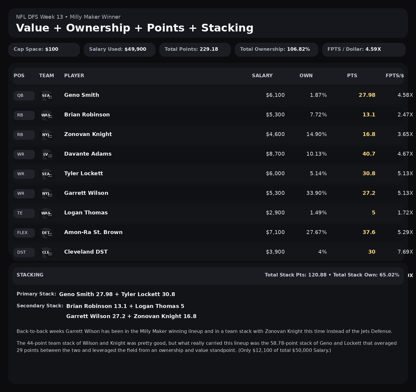 The structural uniqueness is the quarterback choice and the decision to keep the stack skinny. Geno Smith plus Tyler Lockett at modest salary is an efficient way to access a 58.78 point two player outcome without paying the salary and ownership attached to the higher priced quarterback tier. The roster does not add D.K. Metcalf even though he also scored. That is a restraint decision, and it keeps salary available for the Adams and St. Brown pairing.