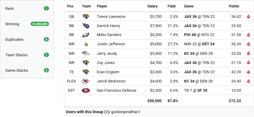 Justin Jefferson is the ownership tax and the roster pays it because the Lions matchup can support a true slate level receiver score. The key is that Jefferson is paired with a lower owned primary stack, so his ownership does not drag the lineup into duplication. Miles Sanders is the quiet stabilizer. Philadelphia can score in multiple ways, but the Giants run defense vulnerability gives Sanders a path to a ceiling that does not require an extreme passing day.