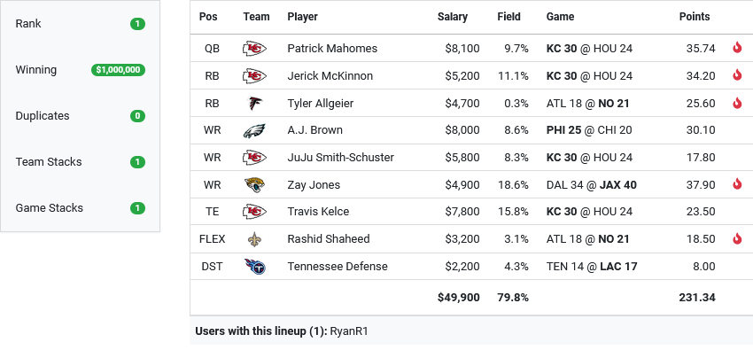 Outside the Chiefs, the roster finds separation through two thin, low owned hits that fit together structurally. Tyler Allgeier at 0.3 percent scores 25.6. Rashid Shaheed at 3.1 percent scores 18.5 in the same game environment, giving the lineup a two player mini at low ownership and low salary. Those points prevent the roster from needing a Houston run back and keep the build from colliding with the common mid range receiver constructions.