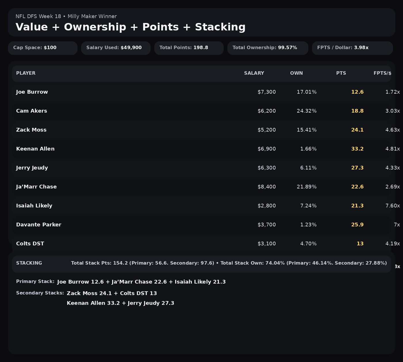 The construction also avoids the common Week 18 failure mode where a roster stacks a quarterback with low certainty pass catchers and hopes for a shootout. This build uses skinny stacks and mini correlations that survive late inactive chaos. Burrow plus Chase is a name brand pairing, but it does not need to carry the slate. The slate is carried by the Allen Jeudy mini and by the Moss Colts defense pairing.