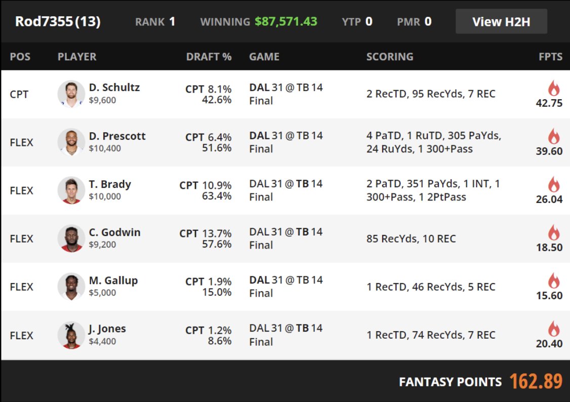| CAPTAIN | Dalton Schultz DAL TE | 8.1% | 9600 | 42.75 |