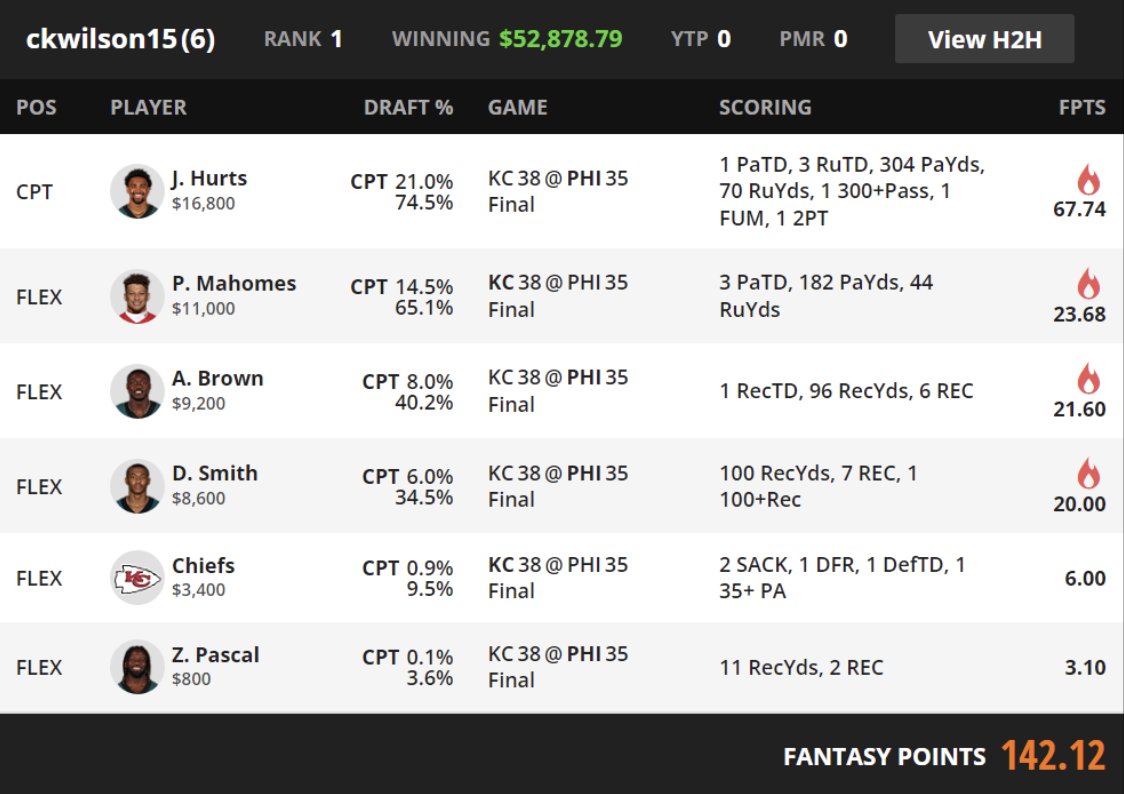This lineup won by leaning into the Super Bowl's most concentrated truth. Philadelphia scoring flowed through Jalen Hurts to an extreme degree, so captain did not need to be cute. It needed to be right. Hurts reached 21.0 percent captain ownership, which is hardly forgotten by the field, yet the multiplier slot still carried leverage because his scoring path was so complete. He threw for 304 yards, ran for 70 more, and scored three times on the ground. Once that happened, every non Hurts captain lineup was drawing dead unless it found a far narrower touchdown map.