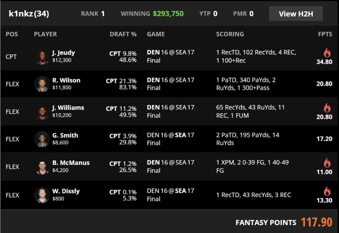 The captain choice did most of the heavy lifting, though the full build stayed sharp from top to bottom. Jeudy captain at 9.8 percent gave the lineup access to Denver's best receiving outcome without following the more crowded Russell Wilson captain route. Will Dissly then supplied the low owned bring back many lineups ignored because they assumed Seattle production would run through wider receiver ownership clusters.