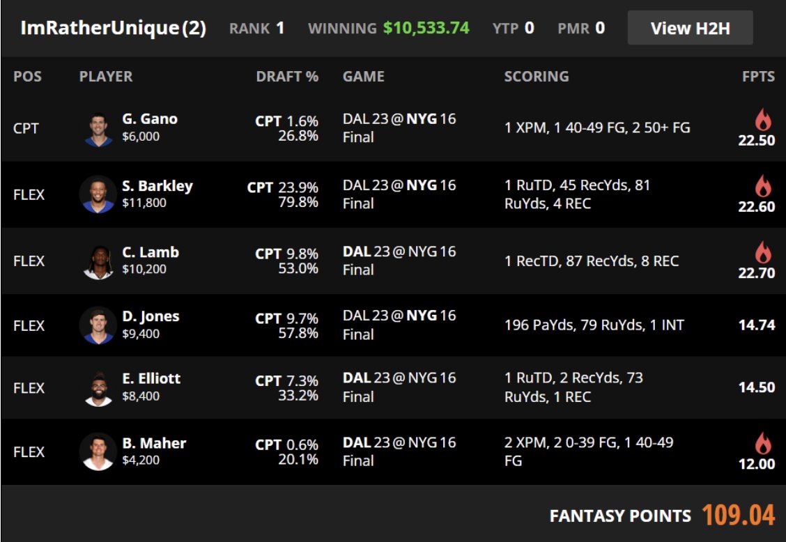 Graham Gano captain carried almost the entire uniqueness burden. At 1.6 percent captain ownership, the roster immediately stepped outside the field's preferred scoring paths. After that, the build became much less impressive. It used the full 50,000 salary, included two kickers, and had only one player under 20 percent ownership. Barkley, Lamb, Jones, Elliott, and Maher formed a shell the field could reach easily once the game settled into a lower scoring divisional grind.